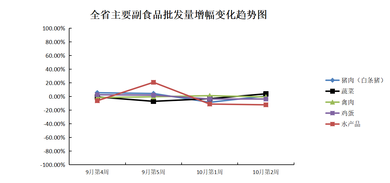 10月份第2周(2025年10月11日—10月17日),本周我省主要副食品市场运行情况:除猪肉、蔬菜外其余产品平均批发价均有所下跌;除猪肉、蔬菜外所有产品批发量均有所减少。平均批发价方面:猪肉、蔬菜环比上涨;水产品上涨不明显,与上周基本持平;禽肉、鸡蛋环比下跌。批发量方面:蔬菜环比增加;猪肉增加不明显、禽肉减少不明显,与上周基本持平;鸡蛋环比减少;水产品减幅较大,超过10%。