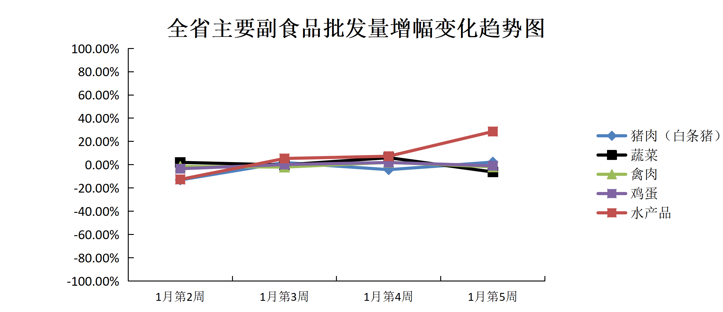 2026年1月份第5周(2026年1月24日—2026年1月30日),本周我省主要副食品市场运行情况:除鸡蛋、水产品外所有产品平均批发价均有所下跌;除猪肉、水产品外所有产品批发量均有所减少。平均批发价方面:鸡蛋、水产品环比上涨;蔬菜、猪肉、禽肉价格环比下跌。批发量方面:水产品增加幅度较大,超过20%;猪肉环比增加;鸡蛋减少不明显,与上周持平;禽肉小幅减少;蔬菜环比减少。